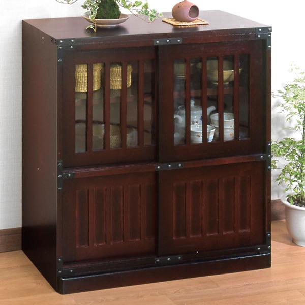 - 棚・ラック・シェルフ > 木製ラック・ウッドラック > 美品 民芸家具 水屋箪笥 キャビネット 食器棚 飾り棚 ミドルボード 引戸 格子 ミヤグチ企販 キャビネット 民芸調 格子デザイン 引き戸収納 幅67cm
